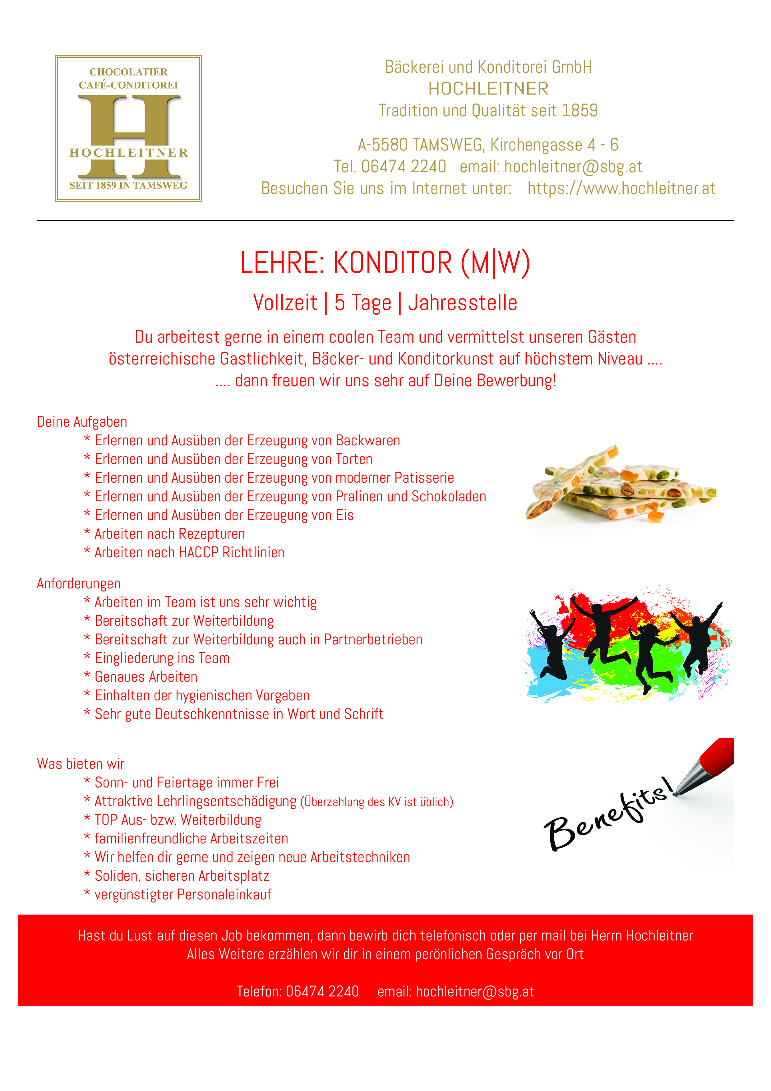Wir sind ein 1859 gegründetes Familienunternehmen mit Tradition und zählen zu den rennomierten Ausbildungsbetrieben im Salzburger Land.Unsere Philosophie steht für Qualität, Leidenschaft und gutes Betriebsklima.Zufriedene Mitarbeiter mit guter Ausbildung garantieren den Qualitätsanspruch, den wir seit Gründung im handwerklichen Segment verfolgen. Einen sehr hohen Stellenwert hat der kollegiale, respektvolle Umgang untereinander - Mitarbeiter und chefs inbegriffen!Wertschätzung ist die Grundlage unseres Erfolgs.Für unseren Betrieb in Tamsweg suchen wir motivierte und talentierte Mitarbeiter die unsere Begeisterung für das Zuckerbäcker- und das Bäckerhandwerk teilen.Wir freuen uns auf Ihre InitiaivbewerbungOFFENE STELLENVERKÄUFERIN30-35 Stunden / 5 Tage / ab Mai 2026LEHRLINGE FÜR 2026/27- KONDITOR- KELLNER- BÄCKER